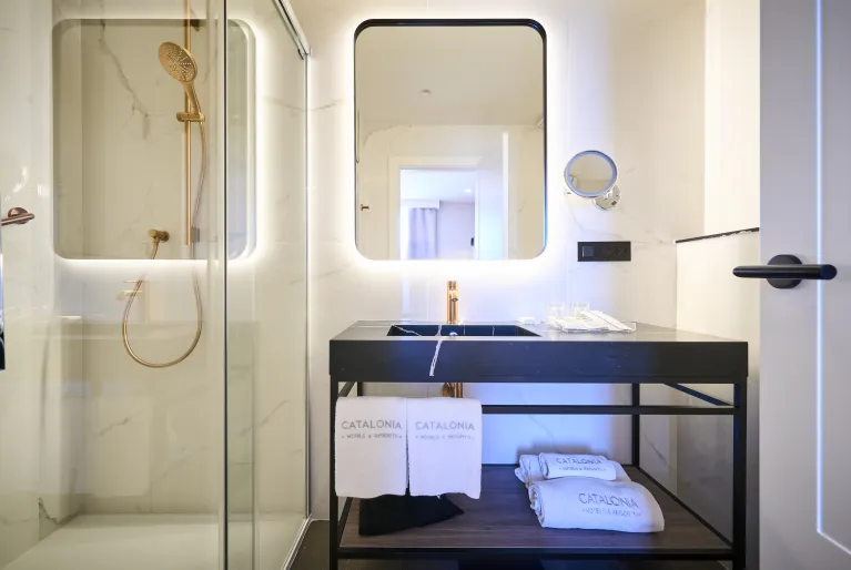 Imagine waking up in one of the most popular streets of Barcelona: you can, at the Catalonia Portal de l’Àngel. The building is an old Neoclassical-style palace set in a prime location between Plaza Catalunya and the Gothic Quarter, just a few steps from Barcelona Cathedral. Explore the city from this urban hotel that offers modern rooms, including a large suite.