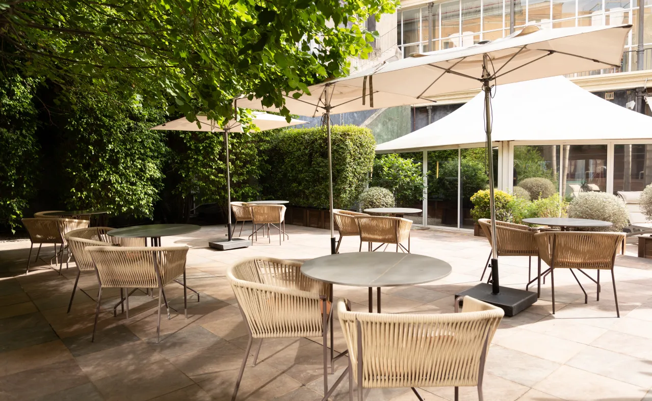 This haven of peace in the middle of the city is divided into two main areas: on the one hand, the glass-enclosed and heated pergola where every morning you can enjoy a varied buffet breakfast with local products. On the other hand, the Jardí de l'Àngel completes its desire to be a space of calm and relaxation with the terrace area, finished in wood and with a solarium. Take a refreshing swim in the beautiful pool or rest at our designer tables under the umbrellas.