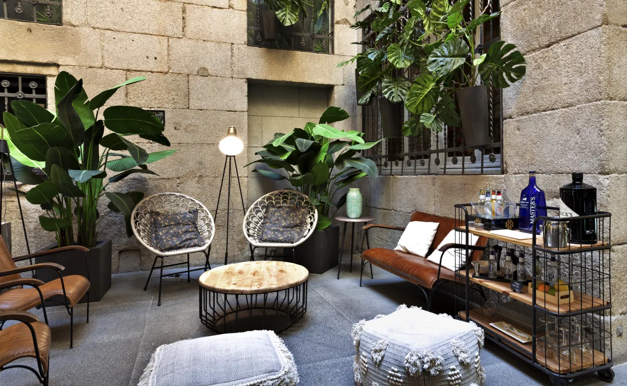 On the other hand, the main staircase is unique in the area and of great beauty: we were able to rescue the steps and wooden balustrades with plaster moldings in their entirety. The interior of the hotel is articulated around the interior patio typical of the time where, according to the neighbors, "chulapos" from the neighborhood would gather to smoke and talk to the women. Decorated with plants and modern furniture, it is a rest space crowned by a skylight on the top floor, which gives it great light.