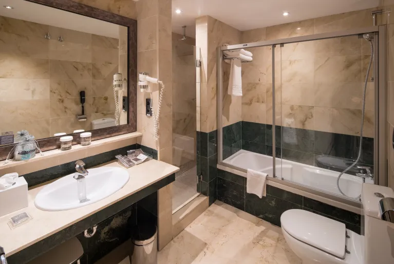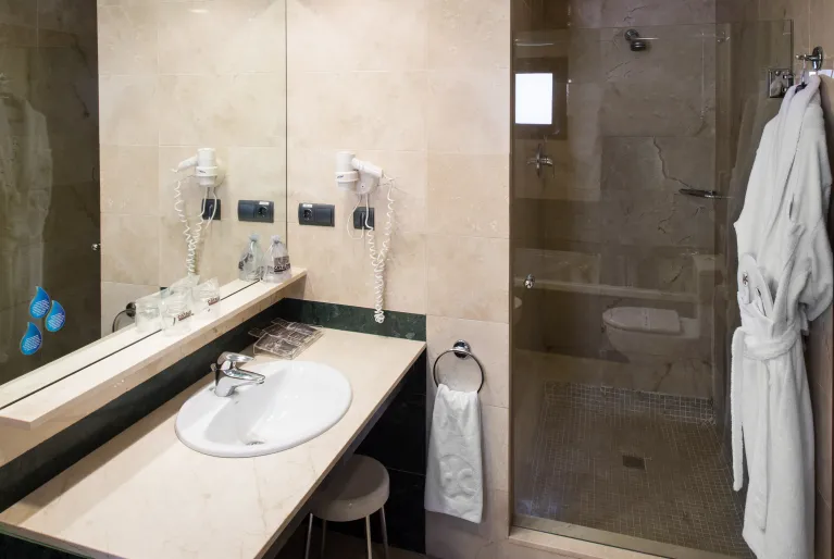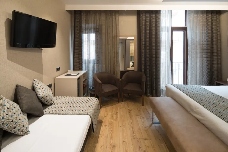 Podrás escoger entre un total de 90 habitaciones, todas con una decoración elegante, suelo de parquet, baño de mármol, televisión de 50 pulgadas y demás comodidades para que tu estancia sea lo más confortable posible. Decántate por nuestra habitación suite y disfrutarás de una terraza privada donde relajarte o broncearte, además de una sala de estar independiente con sofá y un gran escritorio de trabajo.