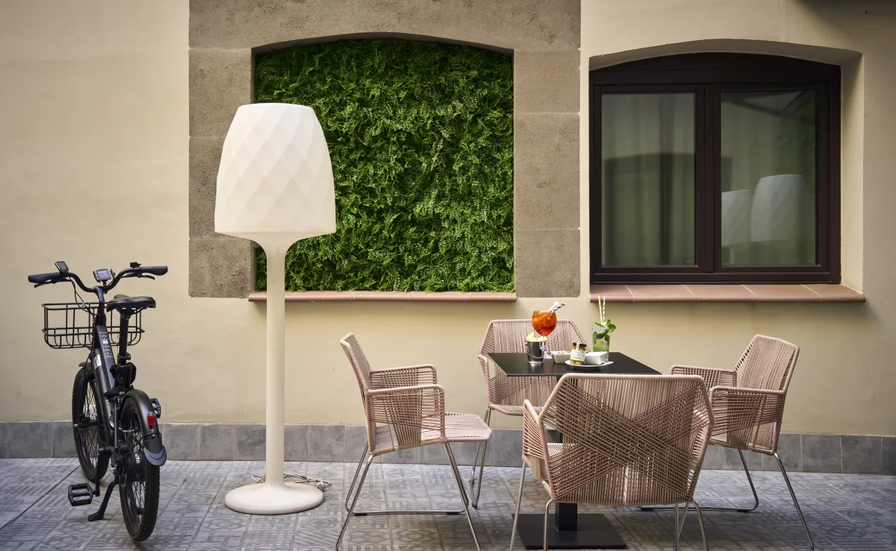 Desde Catalonia quisimos preservar este patrimonio histórico de la ciudad y, por ello, llevamos a cabo la rehabilitación del edificio con el máximo respeto a sus componentes originales, conservando íntegramente la fachada y el patio interior. Este último es uno de los espacios más singulares de nuestro hotel y cuenta con una gran claraboya que actúa como cierre y provee de una gran luminosidad todas las zonas comunes: el restaurante, el bar y el salón. Cuando entres al hotel Catalonia Born te recibirá un moderno lobby en el que se conserva la escalera original restaurada.