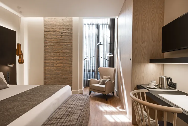 Escoge entre las más de 180 habitaciones del hotel Catalonia Gran Vía Madrid, todas ellas renovadas y con una decoración cálida en maderas y tonos beige que invitan a la tranquilidad y al descanso. Algunas destacan por sus terrazas con vistas a la Gran Vía, otras por contar con su propio jacuzzi exterior privado. Mención aparte merece nuestra espectacular suite terrace con jacuzzi, que dispone de salón y dormitorio independientes y todo un lujo de vistas sobre la ciudad.