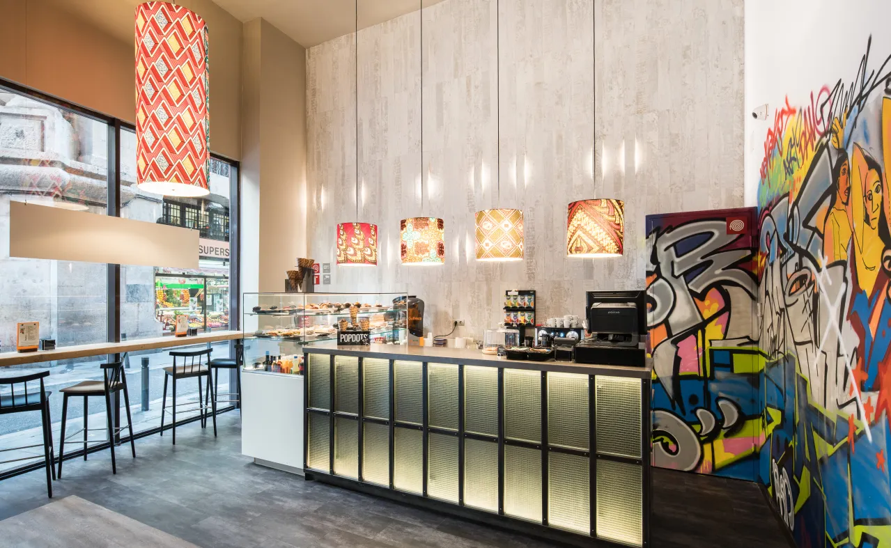 L'hotel Catalonia Avinyó vi accoglierà all'arrivo con una facciata moderna che contrasta con gli edifici adiacenti e una hall di design piena di colore, con graffiti sui muri e lampade di ispirazione etnica. Appena entrati, sulla sinistra, troverai la nostra caffetteria con panini, dolci, caffè e bibite, oltre a tavolini e poltroncine dove rilassarti sia che tu sia un ospite dell'hotel o che tu voglia fare una pausa dalla tua giornata. Vai sul retro per raggiungere la reception e ammirare lo spettacolare giardino verticale del nostro patio interno, ricoperto di piante che donano molta luce e bellezza naturale allo spazio.