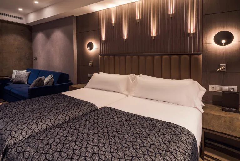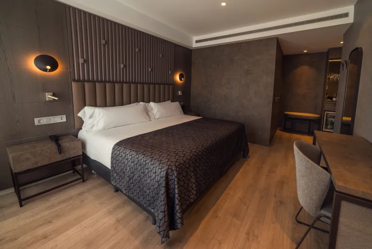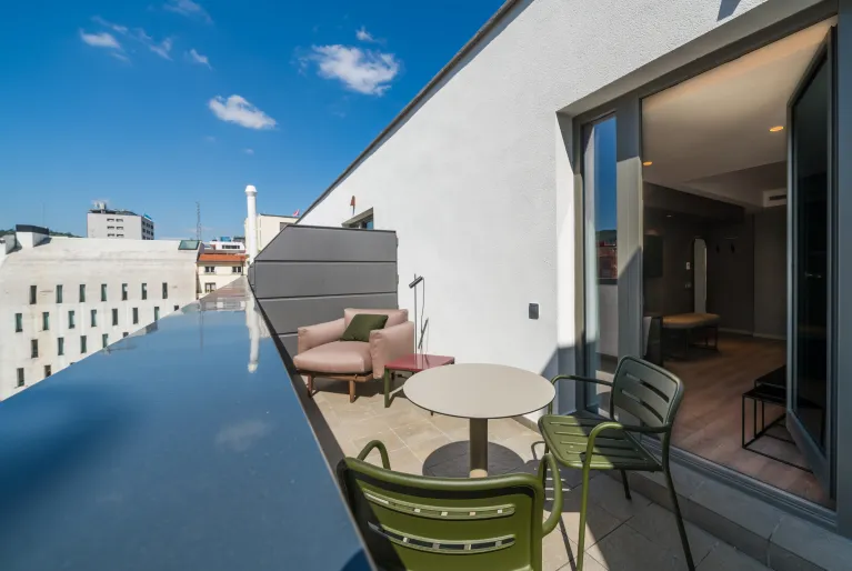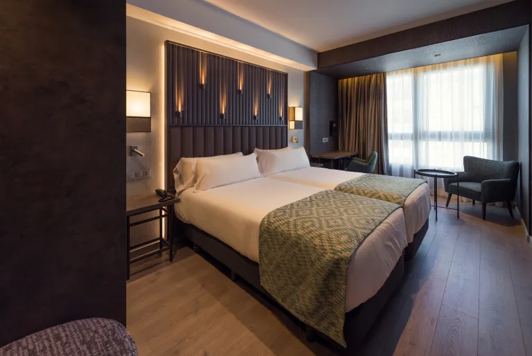 Dentro do hotel encontrará a tranquilidade que procura depois de passar o dia na movimentada capital da Biscaia. Inaugurado em 2021, irá recebê-lo com um design vanguardista que mantém a essência do passado industrial de Bilbao, tanto no lobby como no Gastrobar, bem como nos seus mais de 100 quartos, alguns deles com terraços e acesso gratuito para o spa. No rés-do-chão do hotel pode desfrutar de um amplo pátio interior ajardinado com mais de 400 m2 onde pode ler, trabalhar ligando-se ao Wi-Fi gratuito ou tomar uma bebida.