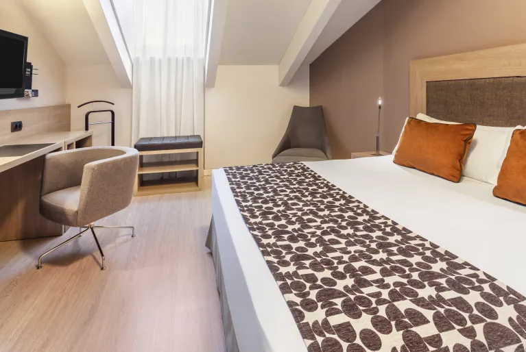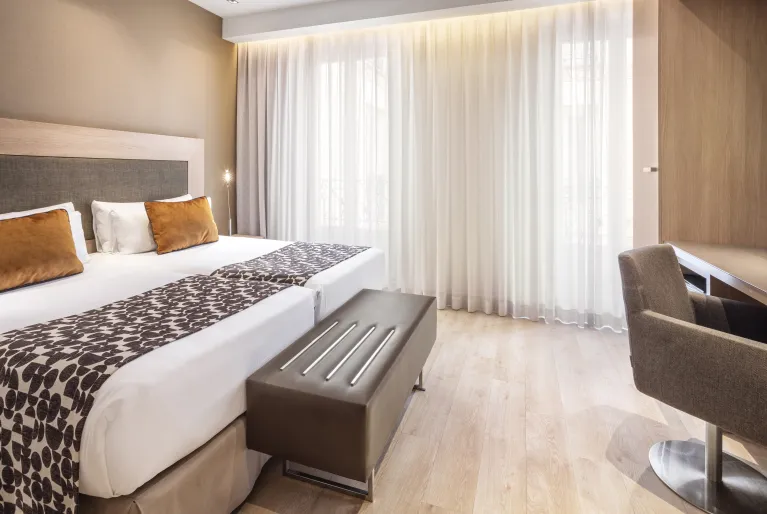 Todos os quartos do hotel foram pensados para o envolver numa sensação de harmonia e tranquilidade que o convida ao descanso graças ao chão em parquet e à decoração em tons de branco, castanho e bege. Dispomos de quartos duplos acessíveis a pessoas com deficiência, que dispõem de casa de banho totalmente adaptada, cabides com puxadores, interruptores à altura adequada, entre outros. Fique num dos quartos com vista para a Calle Atocha e desfrute da vida nesta movimentada rua de Madrid que liga o centro da cidade ao Paseo del Prado. Por outro lado, no nosso terraço premium com piscina privada poderá tomar um banho refrescante sempre que lhe apetecer. Se pretende uma estadia exclusiva, a suite imperial é para si, com sala e quarto separados, tectos inclinados e uma bicicleta giratória na ampla casa de banho.